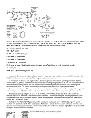 This document describes a simple VHF receiver that can be built for around $20 using a superregenerative design. The receiver requires no special components or test equipment to construct. It uses a single JFET transistor as a superregenerative detector to provide high sensitivity of around 1 microvolt. The receiver can detect both AM and FM signals between 49-55 MHz with modifications allowing it to receive other VHF bands. With adjustments to the regeneration control and quench waveform control, the receiver can be tuned to receive narrowband FM transmissions with reasonable selectivity.