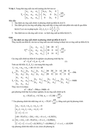 Tài liệu hướng dẫn tính toán trạng thái ứng suất và biến dạng tại điểm k (4;4;7) trong môi trường. Các ứng suất chính và phương chính, cũng như ứng suất pháp, ứng suất tiếp và các ten-xơ liên quan được xác định. Ngoài ra, tài liệu cũng đề cập đến kỹ thuật tìm phương chính và mẹo giải hệ phương trình liên quan đến biến dạng và ứng suất tại điểm k.