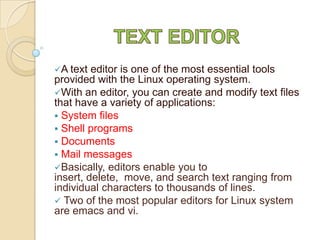Vi is a basic text editor that is included with Linux and allows users to create, modify, and view text files. It has three main modes: command mode to enter commands, insert mode to add/edit text, and Ex mode to manage files. Some key vi commands allow users to move around files, delete/copy text, save files, and search/replace text. Vi is a powerful but minimal editor that is useful for modifying configuration files and writing code.