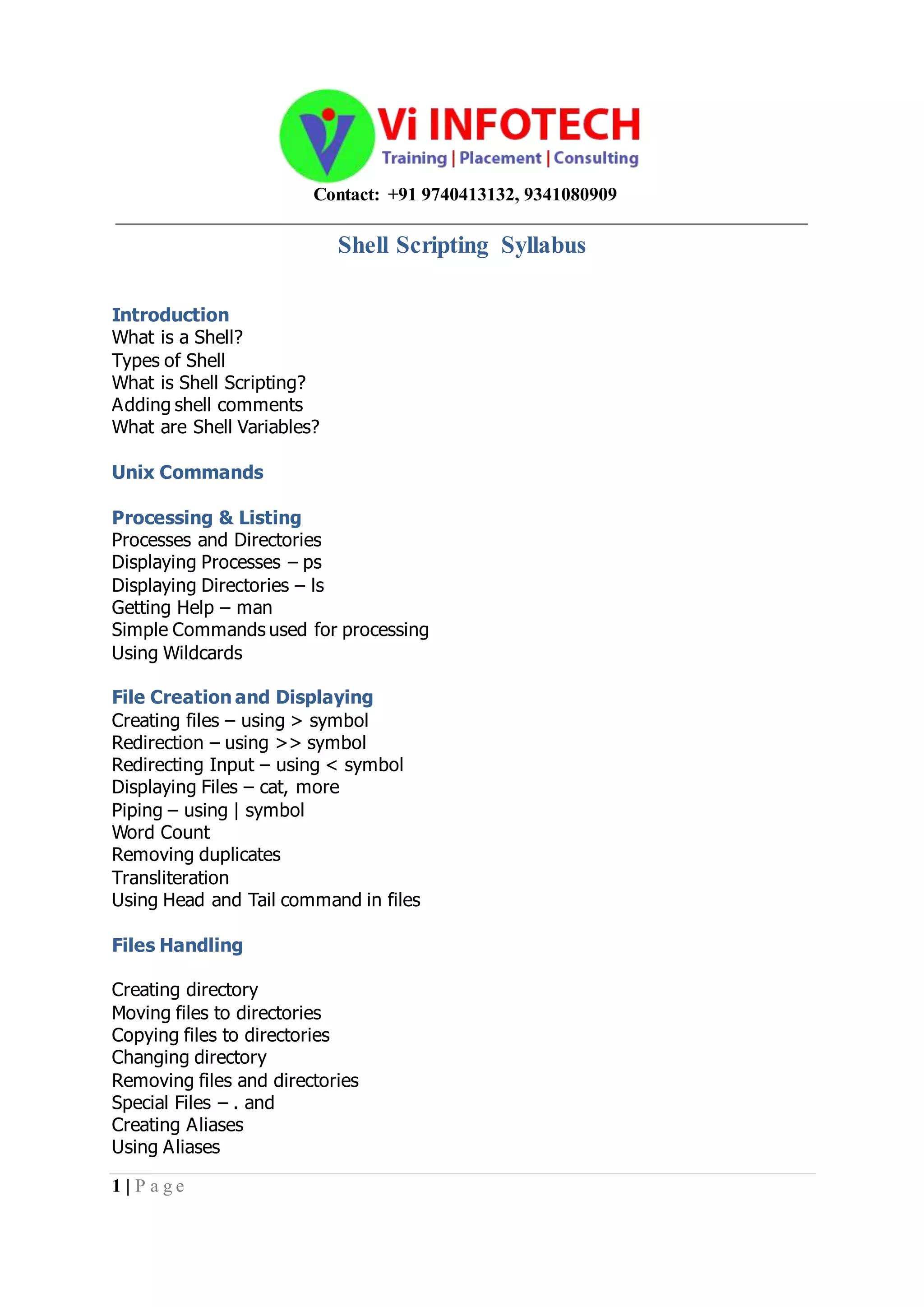 The document outlines a comprehensive syllabus for shell scripting, covering basic concepts such as types of shells, shell variables, and commands for process and file handling. It also delves into advanced topics including job handling, conditional statements, loops, and database connectivity. Key tools and editors like awk, sed, and crontab are mentioned for job scheduling and data manipulation.
