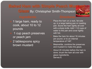 1) Baked Ham with Simple Peach Mustard Glaze, which involves baking a ham and brushing it with a glaze of peach preserves and brown mustard during the last 20 minutes.