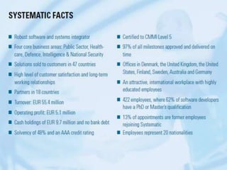 This document discusses competency development at Systematic. It notes the challenges of balancing organizational needs, individual needs, and project needs. It presents four perspectives on development: aligning training with strategic goals; considering impact and return on investment; focusing on factors that determine training impact like preparation, content, and application; and considering alternative structures like learning alliances. It also discusses ensuring development activities are aligned with business needs and learning happens both formally and informally through collaboration, coaching, and real work experiences. The goal is to support the business through faster changes, better project execution, and decreased risk by developing employee competencies.