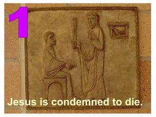 The document describes the 14 Stations of the Cross, which depict Jesus being condemned to death, carrying his cross, falling three times along the way, being helped by Simon and Veronica, being stripped and nailed to the cross, and ultimately dying and being laid in the tomb. It recounts the major events from when Jesus was condemned to death to when his body was laid in the tomb after his crucifixion.