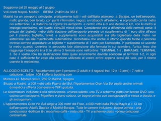 Il documento è una mini-guida turistica per un viaggio a Madrid, evidenziando dettagli sui voli, trasporti dall'aeroporto al centro, alloggio e punti d'interesse. Viene descritta la capitale spagnola, con oltre 3 milioni di abitanti, la sua ricca storia, monumenti culturali, e il clima variabile. Infine, si fa cenno a luoghi emblematici come il Palazzo Reale e il Parco del Retiro, suggerendo attività e informazioni utili per i visitatori.