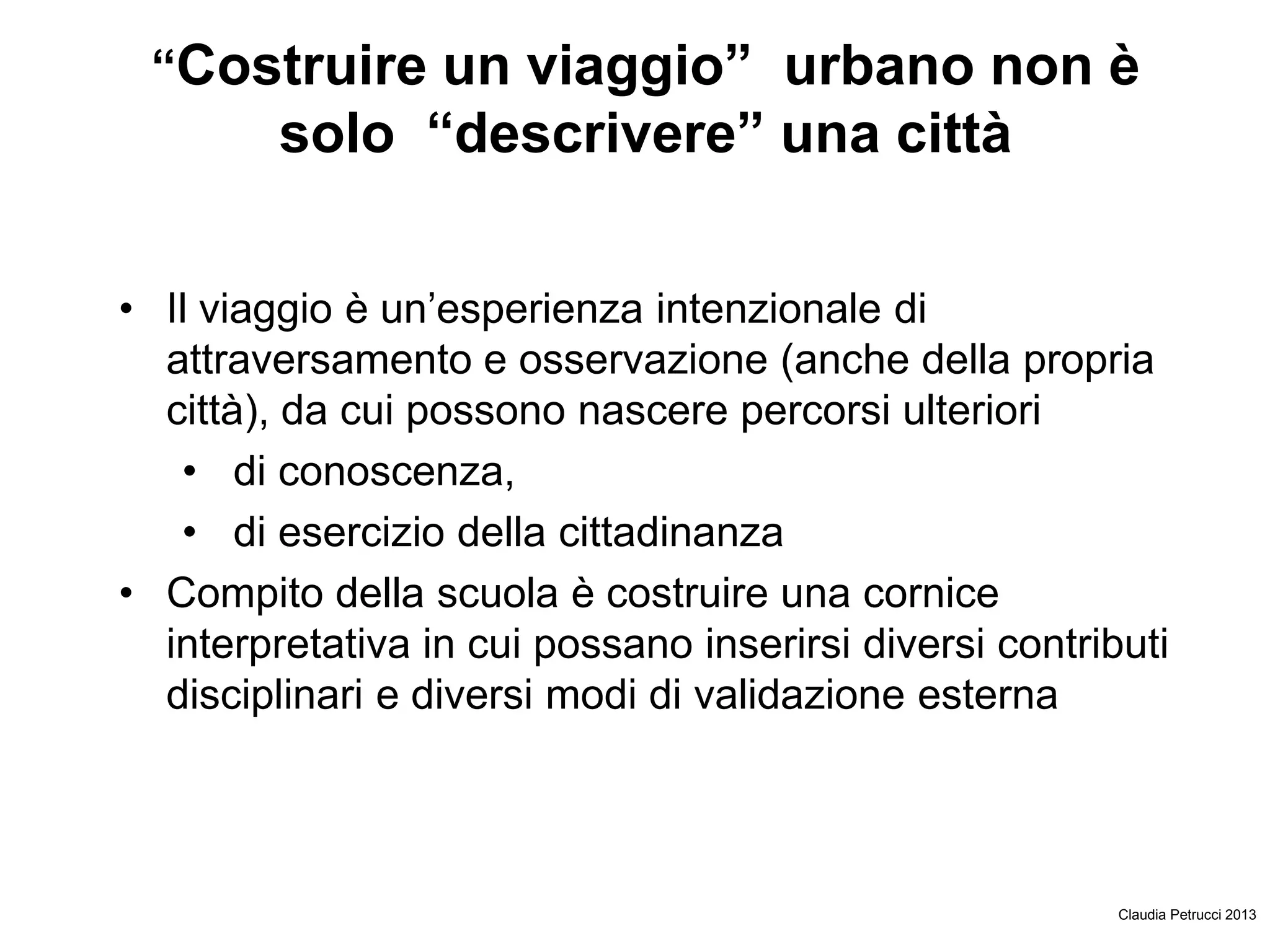 Il documento esplora il concetto di 'viaggio urbano' come un'esperienza che favorisce la conoscenza e la cittadinanza, sottolineando l'importanza della 'varietà urbana' nel creare bellezza e appartenenza in una città. Viene analizzata la crescita della 'varietà urbana' e i rischi di riduzione in contesti metropolitani contemporanei, evidenziando la necessità di strumenti e competenze per riconoscere e salvaguardare elementi significativi della città. Infine, si propone un laboratorio come metodo per coinvolgere i cittadini nelle scelte di politica urbana.