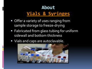 Vials and syringes can be used for a variety of purposes like sample storage and freeze-drying. They are fabricated from glass for uniform thickness and can be autoclaved. A variety of sterile syringes and needles are available for laboratories along with vials that combine easy screw caps with excellent autosampler handling. Vials and closures are designed for optimum performance with HPLC and LC/MS applications.