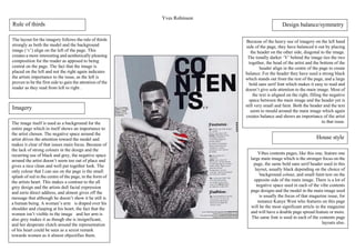 This document analyzes the design of magazine contents pages featuring a prominent image of an artist. It notes that the pages typically use negative space around a large primary image of the featured artist. The artist in the image, like Kanye West, is usually the subject of the magazine's main article. The document discusses how the imagery, including a splash of red representing the artist's heart, is used to draw attention to the artist while balancing other design elements like the header text. It also notes that the layout follows the rule of thirds composition by placing the artist image off-center on the left side to engage readers.