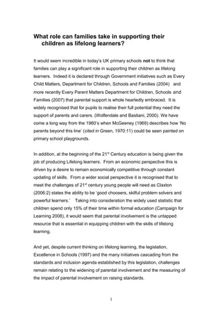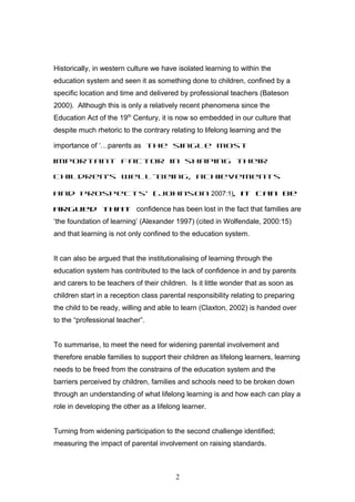 This document discusses the role that families can play in supporting children as lifelong learners. It argues that the family environment provides a supportive learning environment that develops many of the key competencies for lifelong learning, such as the ability to pursue interests, solve problems creatively, and learn from natural experiences and conversations. However, it acknowledges that socioeconomic factors can impact parental involvement. While policies aim to engage all parents, some families remain "hard to reach." Overall attainment is determined by complex interactions between children, their families, peers, communities and schools.
