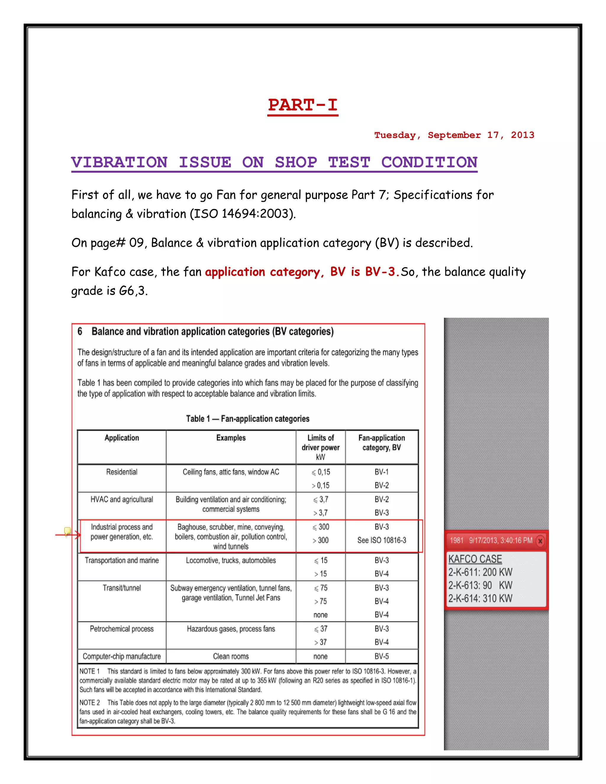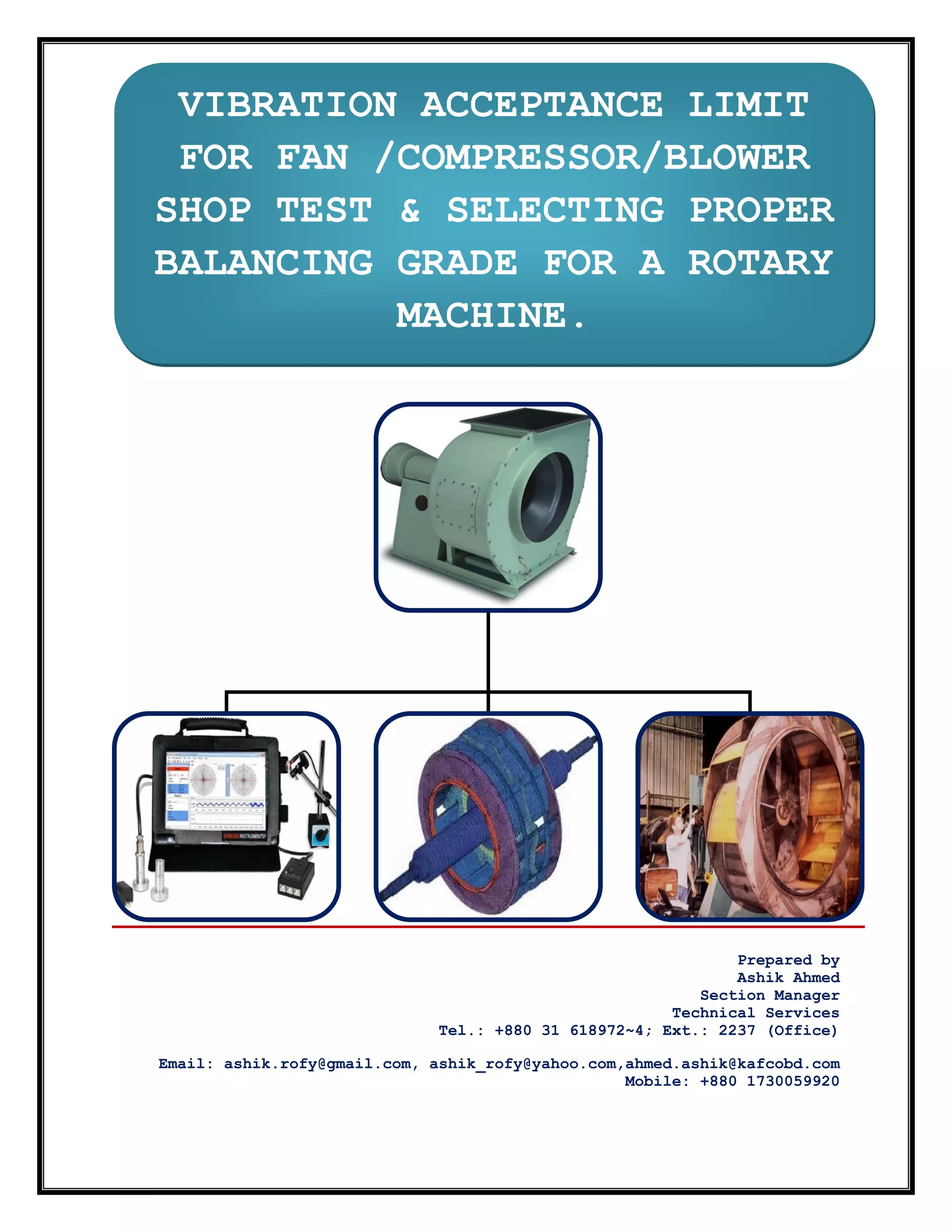 The document discusses vibration acceptance limits for fans, compressors, and blowers during shop tests, outlining the relevant ISO standards for balanced vibrations. It highlights the confusion between rigidly and flexibly mounted vibration limits, emphasizing that for the flexibly mounted fan tested, the vibrations were within acceptable limits of 3.5 mm/s and 3.0 mm/s. Despite this, the desired balance quality grade of g 2.5 based on vendor specifications cannot accept a test value of 3.5 mm/s, leading to a preference for rotor balancing at the vendor's site.