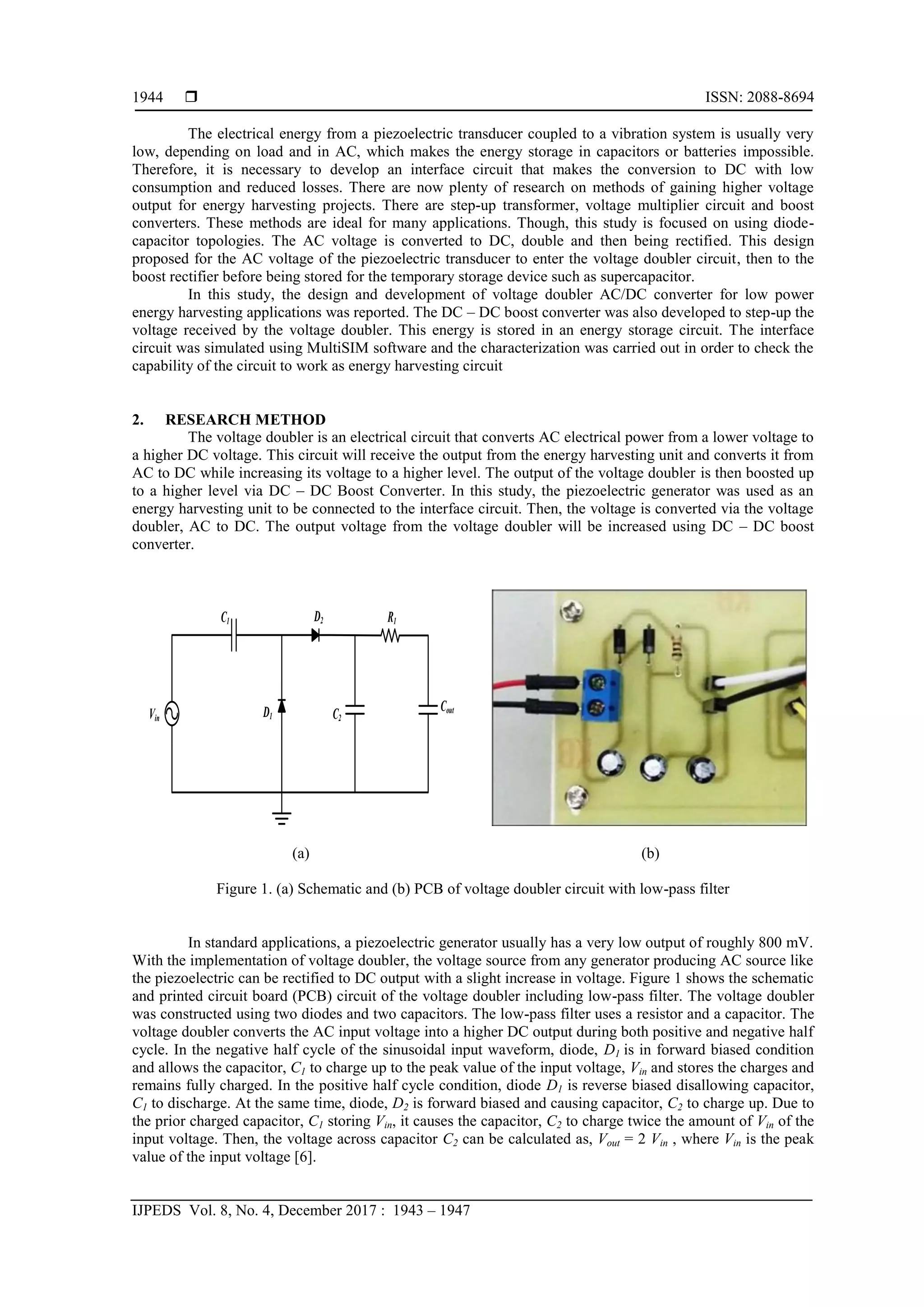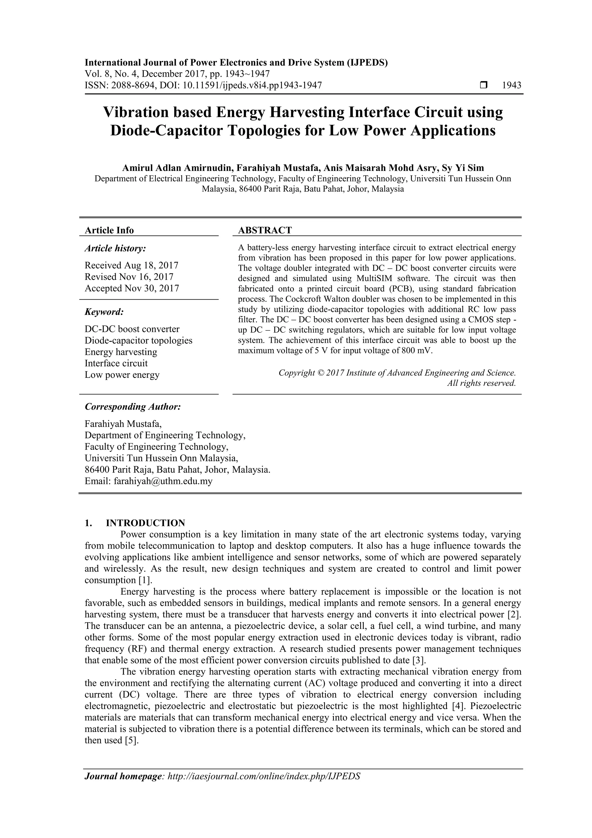 The document presents a design for a battery-less energy harvesting interface circuit that uses diode-capacitor topologies to extract electrical energy from vibrations for low power applications. The voltage doubler and dc-dc boost converter were successfully simulated and fabricated, achieving a maximum output voltage of 5V from an input of 800mV, with an efficiency of 91.8%. The research highlights the potential of piezoelectric energy harvesting systems and proposes an effective solution for powering low-energy devices.