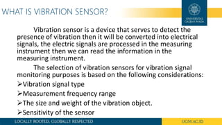 Vibration sensors detect vibrations and convert them into electrical signals. There are two main types: contact sensors that must mount directly to the object, and non-contact sensors that measure vibrations without direct contact. Common contact sensors include piezoelectric accelerometers, piezoresistive accelerometers, and strain gauges. Common non-contact sensors include microphones, laser displacement sensors, and eddy current sensors. Vibration data can be analyzed in both the time and frequency domains to diagnose machine problems.