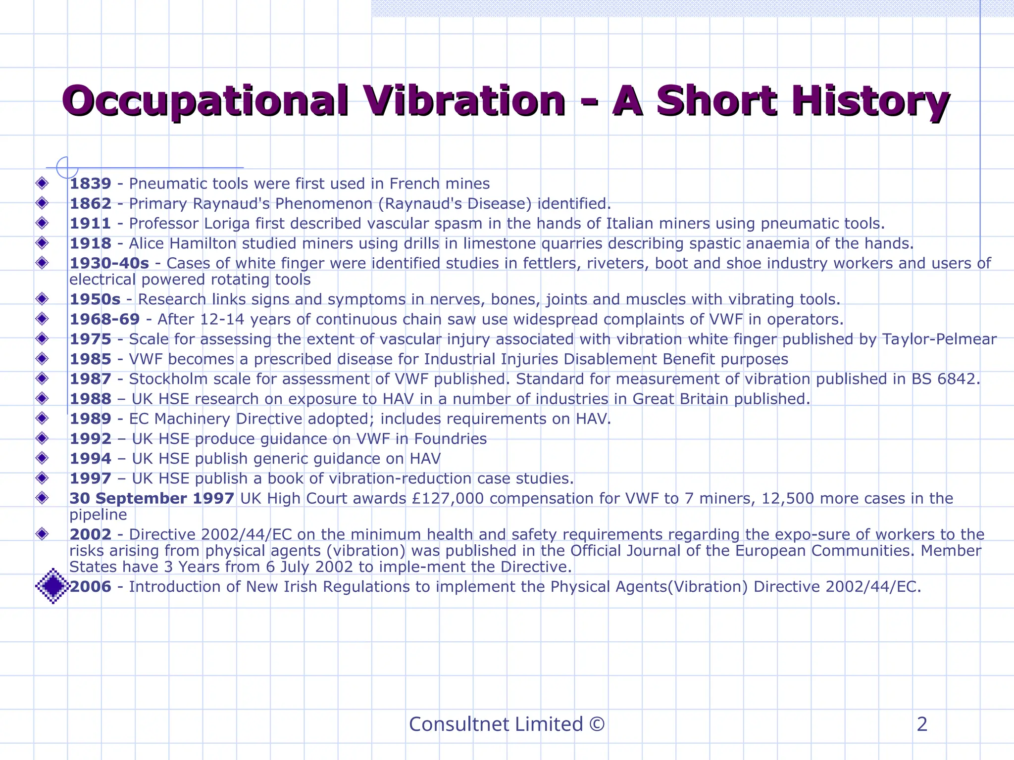 2006 - Introduction of New Irish Regulations to implement the Physical Agents(Vibration) Directive 2002/44/EC.