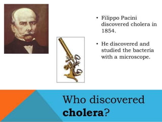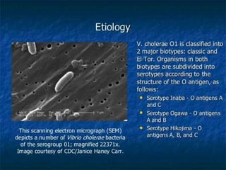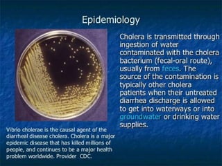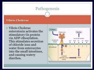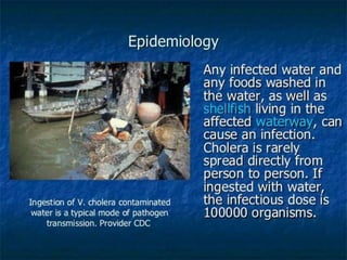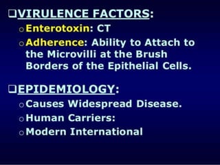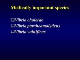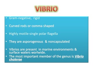 This document discusses Vibrio cholerae, the bacteria that causes cholera. It describes the morphology and characteristics of V. cholerae, including that it is a curved, motile rod shaped bacteria. It also covers the history of its discovery, methods of diagnosis from stool samples, cultural characteristics on selective media, and pathogenesis of cholera. Treatment involves oral rehydration to replace fluids and electrolytes lost from diarrhea and vomiting.