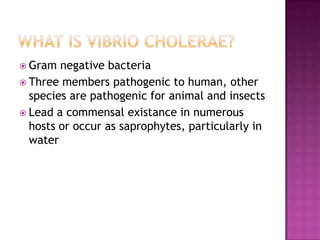 Vibrio cholerae is a gram-negative, curved rod-shaped bacteria that is the cause of the disease cholera. It is found in fresh and brackish water throughout the world. There are three pathogenic strains that cause disease in humans. Cholera is transmitted through ingesting contaminated food or water and causes acute, watery diarrhea that can lead to severe dehydration and death if untreated. Diagnosis involves culturing the bacteria from stool samples and identifying its unique biochemical characteristics.