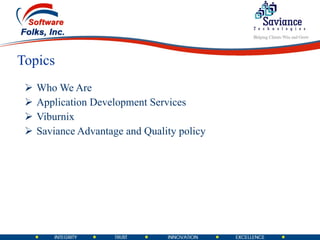 Saviance Technologies, founded in 1999, provides IT services and application development with a focus on the education sector, holding ISO 9001:2008 certification. The company has received multiple accolades, including recognition as one of the fastest-growing private companies in the U.S. and is committed to delivering high-quality solutions through a client-centric approach and a professional management team with extensive industry experience. Their Viburnix platform enhances communication and collaboration for educational institutions while connecting alumni for professional and personal development.