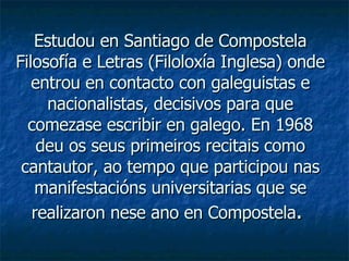 Estudou en Santiagode Compostela Filosofía e Letras (Filoloxía Inglesa) onde entrou en contacto con galeguistas e nacionalistas, decisivos para que comezase escribir en galego. En 1968 deu os seus primeiros recitais como cantautor, ao tempo que participou nas manifestacións universitarias que se realizaron nese ano en Compostela .