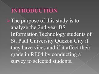 The document analyzes whether vices affect the RE04 grade of 2nd year BS Information Technology students at St. Paul University Quezon City. A survey was conducted of 30 randomly selected students about their vices and RE04 performance. The researchers found that students were able to balance their vices and studies, as vices did not negatively impact academic performance. Both students with and without vices passed RE04. The researchers concluded that students' study habits and class participation, not vices, determined RE04 grades.