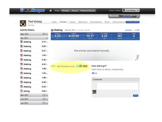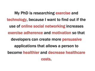 1) The document discusses research into whether using online social networks can increase exercise adherence and motivation. The goal is to help developers create more persuasive health apps.