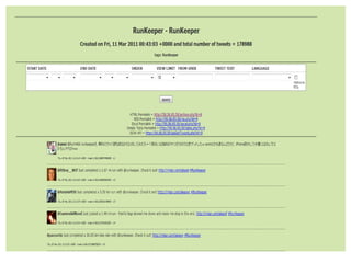 2) It outlines initial findings from analyzing workout tweets from several fitness hashtags, including the number of tweets, unique users, and tweets per day for each hashtag.