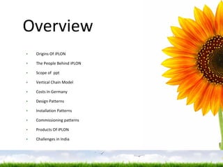 iPLON is a German technology company that provides solar lifecycle management solutions for large-scale PV solar farms. They have over 5 years of experience in solar monitoring and control applications. Their solutions cover the entire lifecycle from design to installation to ongoing operations and maintenance. They have a team of 20 engineers and technicians based in Germany. Their modular platform can be customized for PV projects ranging from 5kWp to 20MWp. Key components of their solution include monitoring equipment, string level monitoring, environmental sensors, and remote management and diagnostic tools.