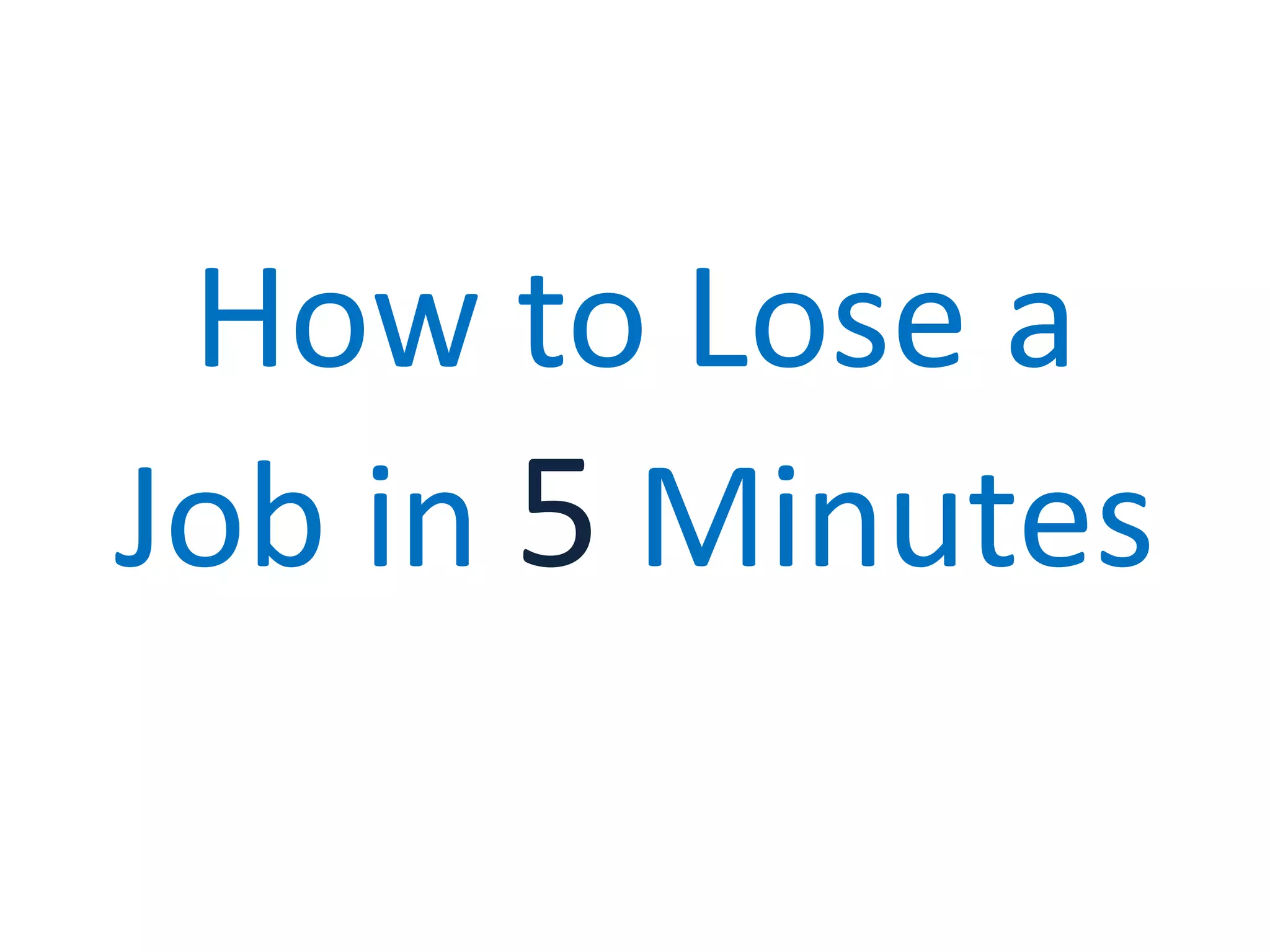 This document provides guidance on how to quickly lose a job in 5 minutes by being late, leaving early, taking too many breaks or staying on breaks too long since time is the number one reason for job loss. It also lists other reasons such as negative social skills like gossiping, swearing, complaining and ignoring company policies or rules. Employers value dependability, loyalty, willingness, helpfulness and cheerfulness.