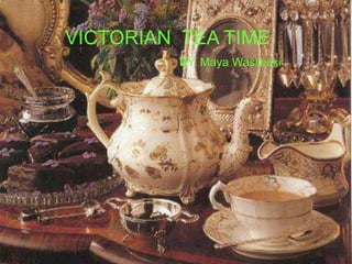 Victorian tea time consisted of expensive drinks like tea and coffee, as well as multi-course meals including cheeses, crumpets, and special dishes created for Queen Victoria's jubilees. Foods served included cheese straws, crumpets with jam, and cakes like jubilee cake. Beverages included ginger lemonade and vinegar cookies and hickory nut drops were among the sweets served. The document provides details on typical drinks, foods, and desserts enjoyed during Victorian-era tea times in England.