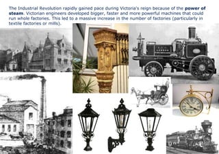 The Industrial Revolution accelerated during Queen Victoria's reign due to the power of steam, which allowed Victorian engineers to develop larger, faster machines that could power entire factories. This led to a huge growth in the number of factories, especially textile mills.