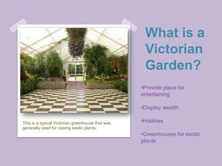 Victorian gardens served several purposes, such as entertaining guests and displaying wealth. They typically included exotic plants grown in greenhouses, flowers, topiaries, statues, and other ornate structures. Victorian gardens were more elaborate than modern gardens, featuring fine grass, decorative shrubs, iron fences, ornaments, and greenhouse for raising exotic plants. Only the wealthy could fully achieve the idealized Victorian garden aesthetic.