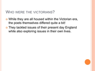 The document discusses notable Victorian poets including Dante Gabriel Rossetti, Christina Rossetti, Matthew Arnold, Alfred Lord Tennyson, Robert Browning, and Elizabeth Barrett Browning, highlighting their contributions to literature and the Pre-Raphaelite movement. Each poet tackled contemporary issues and personal themes, with notable works such as 'Goblin Market' and 'In Memoriam'. It emphasizes the diversity and significance of these poets within the Victorian era.
