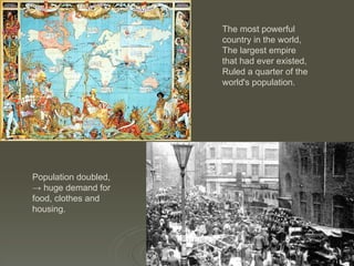The Victorian Period from 1837 to 1901 saw huge population growth in Britain which doubled in size, creating massive demand and transforming the country into the most powerful nation on Earth with the largest empire that had ever existed. New factories and machines emerged alongside new towns, changing the way people lived and worked as Britain industrialized and the railway network expanded. Life in Victorian times depended greatly on social class, with the rich living very different lives than the poor, as poverty, child labor, crime, and lack of access to healthcare and education were rampant issues of the time.