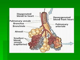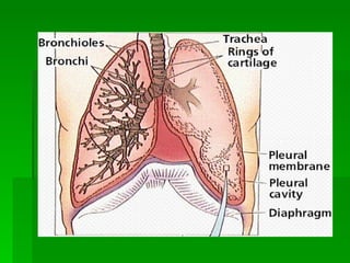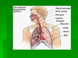 The respiratory system facilitates gas exchange between the body and environment. It involves the intake of oxygen and exhalation of carbon dioxide. Large animals developed respiratory surfaces like lungs and gills to efficiently exchange gases through diffusion. The human respiratory system includes the nose, pharynx, larynx, trachea, bronchi, bronchioles and alveoli which deliver air to the lungs for gas exchange via diffusion between alveoli and capillaries before exhalation. Diseases can impact the respiratory system by affecting airway condition or gas exchange.
