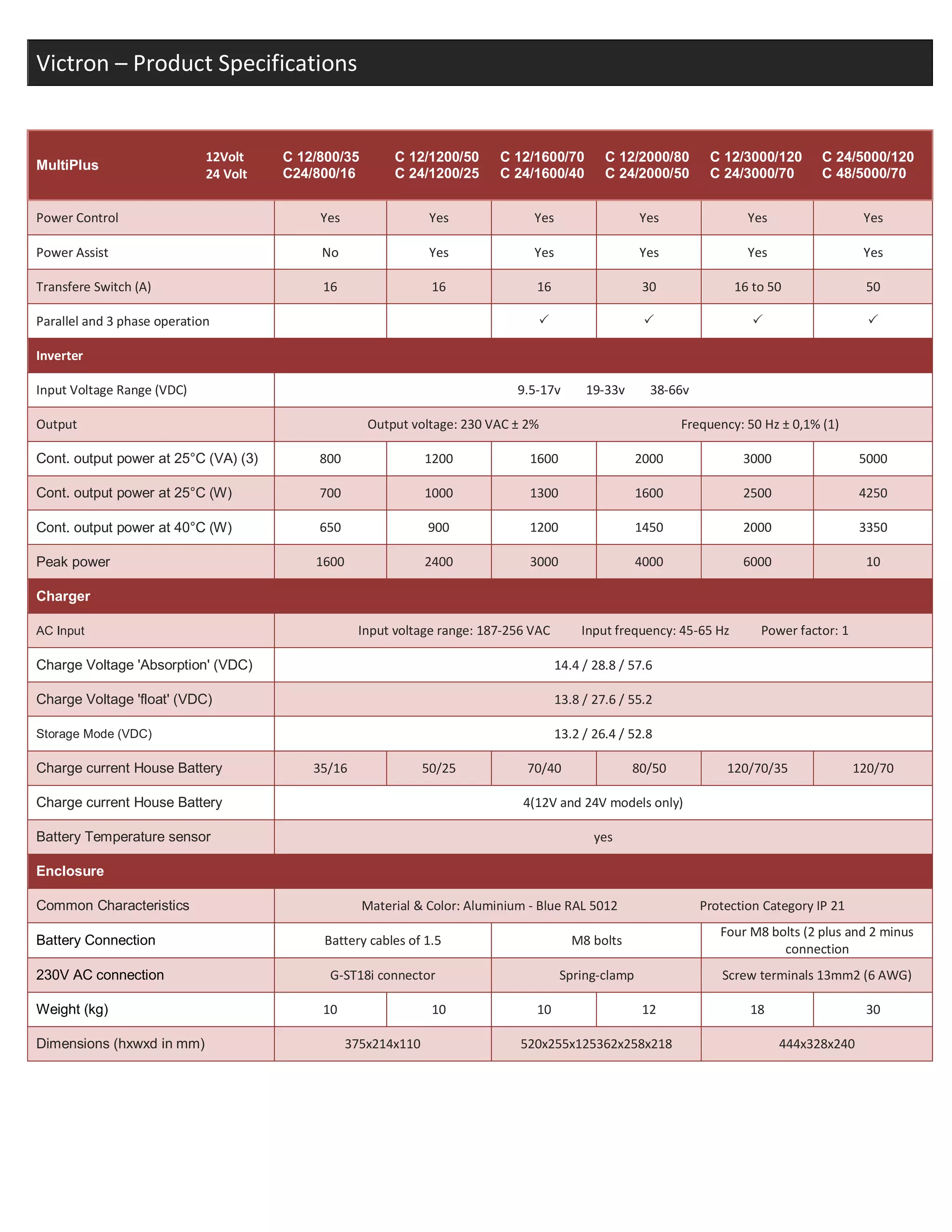 The document provides product specifications for Victron inverters/chargers including the MultiPlus line. It lists various models that operate at 12V and 24V with different continuous output power ratings ranging from 800VA to 5000VA. Key specifications covered include input/output voltage ranges, charging voltages, transfer switch amperage, parallel and three phase operation ability, and enclosure details like dimensions and weight.