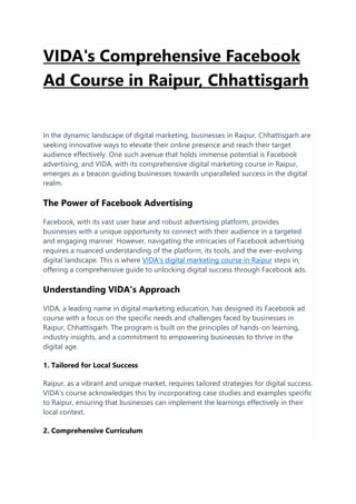 Vida offers a comprehensive Facebook ad course in Raipur, Chhattisgarh, aimed at helping local businesses enhance their online presence through targeted advertising strategies. The course includes hands-on learning, tailored modules for the local market, and showcases success stories from businesses in Raipur that have implemented its teachings. Participants gain insights into crafting effective ad copy, understanding compliance, and maximizing return on investment, supported by experienced instructors and networking opportunities.