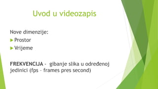 Videozapis obrađuje osnovne dimenzije videa, sustave boja, vrste videa, standarde kompresije, te metode obrade videa. Ključni video standardi uključuju NTSC, PAL i SECAM, dok se kompresija može postići softverskim ili hardverskim kodecima. Također se razmatraju metode izvođenja videa na webu, uključujući streaming i preuzimanje.