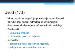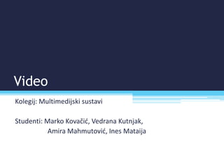 Dokument pruža pregled multimedijskih sustava s fokusom na video tehnologije uključujući prednosti i nedostatke video formata, kao i razlike između analognog i digitalnog videa. Razmatra se kompresija videa, standardi za video signal i metode obrade videa u multimedijskim aplikacijama. Također se ističe važnost uzorkovanja i kodeka u procesu digitalizacije video sadržaja.