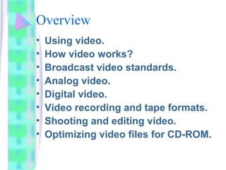 The document discusses various aspects of video systems and design, including how video works, different broadcast standards, analog and digital video formats, video recording tape formats, shooting and editing video, and optimizing video files. It provides details on video compression standards like MPEG and considerations for integrating video into multimedia projects. Overall, the document serves as a guide for understanding video technology and best practices for using video effectively in multimedia design.
