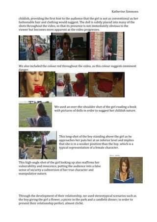The video aimed to create a postmodern parody of a love story with a fragmented nonlinear plot to appeal to an indie audience. Scenes subtly hinted at the doll subplot without making it obvious. Close-ups of the girl getting ready created mystery around her character rather than objectifying her. The relationship seemed perfect through cliches but cuts to the girl's disturbing obsession with the doll created a postmodern effect. Through the boy's realization of her manipulation and the doll's role, the video used horror film techniques to build tension and merge the storylines, concluding with the girl looking to the camera and implying the viewer is her next target.