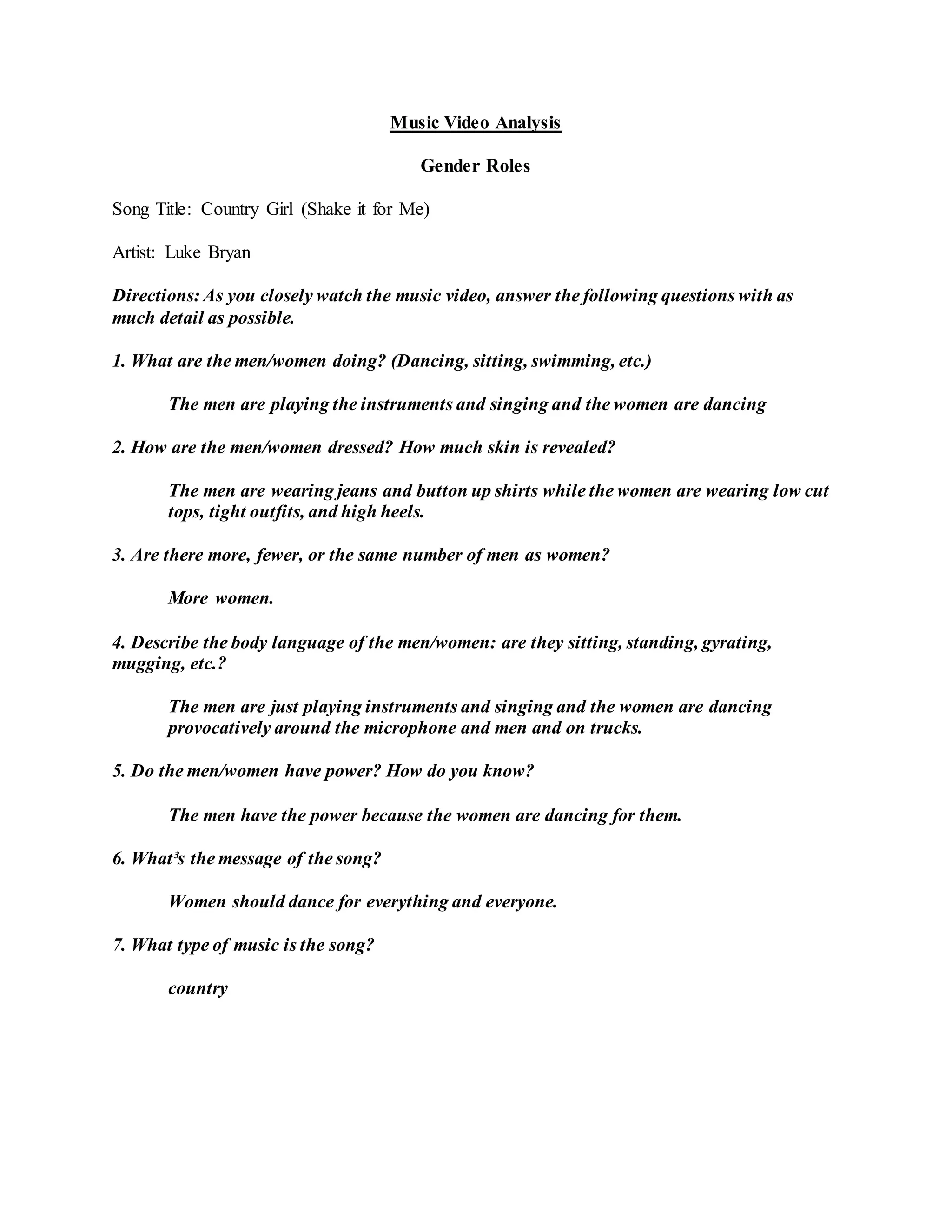 The document provides analyses of 9 music videos based on themes of gender roles, race, sexuality, materialism, and violence. For each video, the author answers questions about the content, messages, and types of representations in the music and music videos. The videos depict a range of themes from gender stereotypes to same-sex relationships to domestic violence.