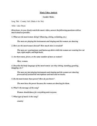 The document provides analyses of 9 music videos based on themes of gender roles, race, sexuality, materialism, and violence. For each video, the author answers questions about the content, messages, and types of representations in the music and music videos. The videos showcase a range of themes from gender stereotypes to same-sex relationships to abusive relationships.