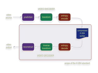 Video coding standards define bitstream structures and decoding methods for video compression. Popular standards include MPEG-1/2/4 and H.264/HEVC developed by ISO/IEC and ITU-T. Standards are developed through identification of requirements, algorithm development, selection of core techniques, validation testing, and publication. They enable interoperability and future decoding of emerging standards. [/SUMMARY]