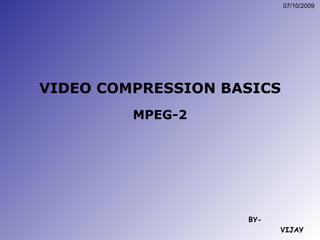 The document discusses video compression basics and MPEG-2 video compression. It explains that video frames contain redundant spatial and temporal data that can be compressed. MPEG-2 uses three frame types (I, P, B frames) and compresses frames using intra-frame and inter-frame encoding techniques like DCT, quantization, and entropy encoding to remove redundancy. The encoding process transforms raw video frames to compressed bitstreams for efficient storage and transmission.