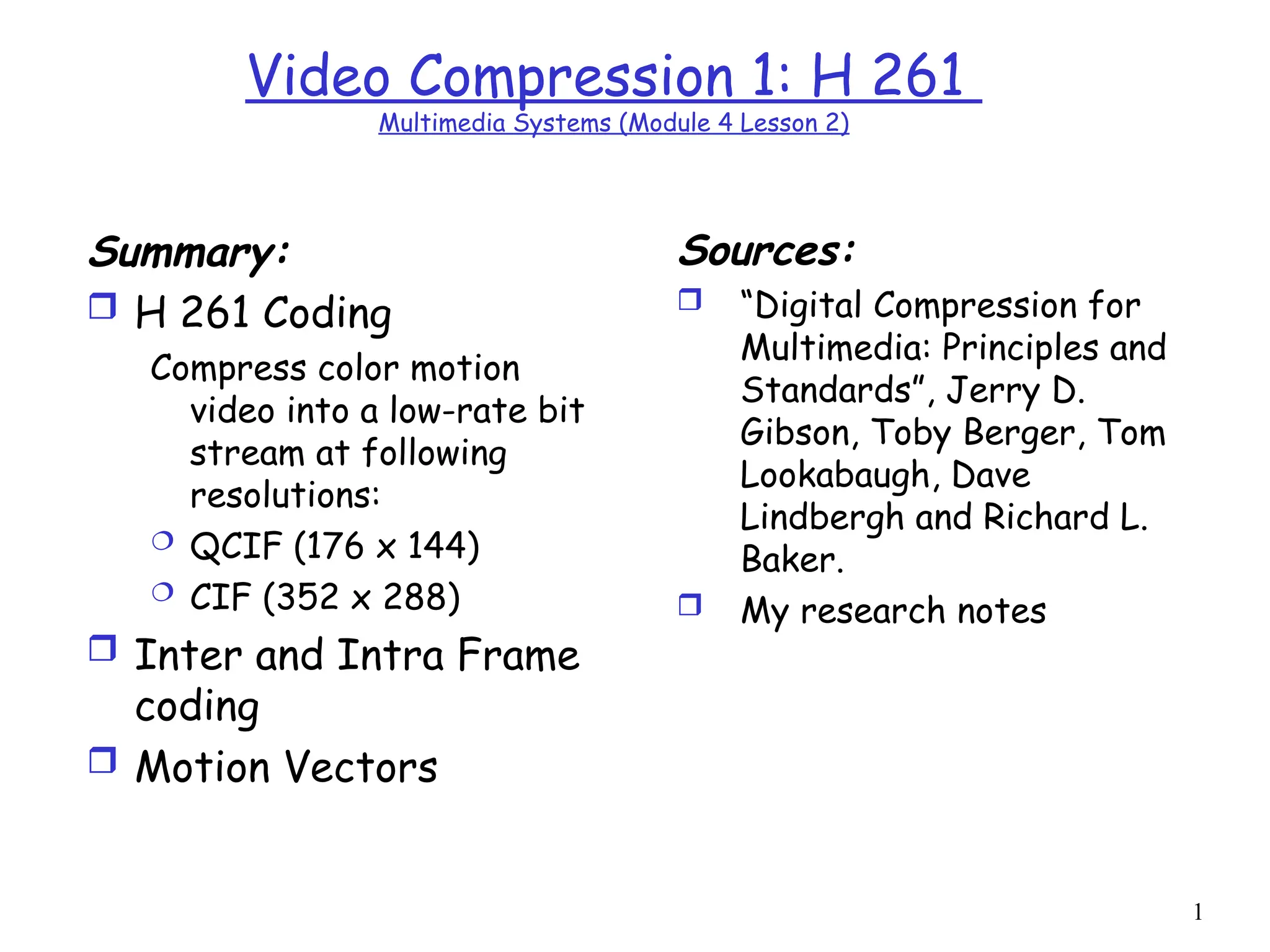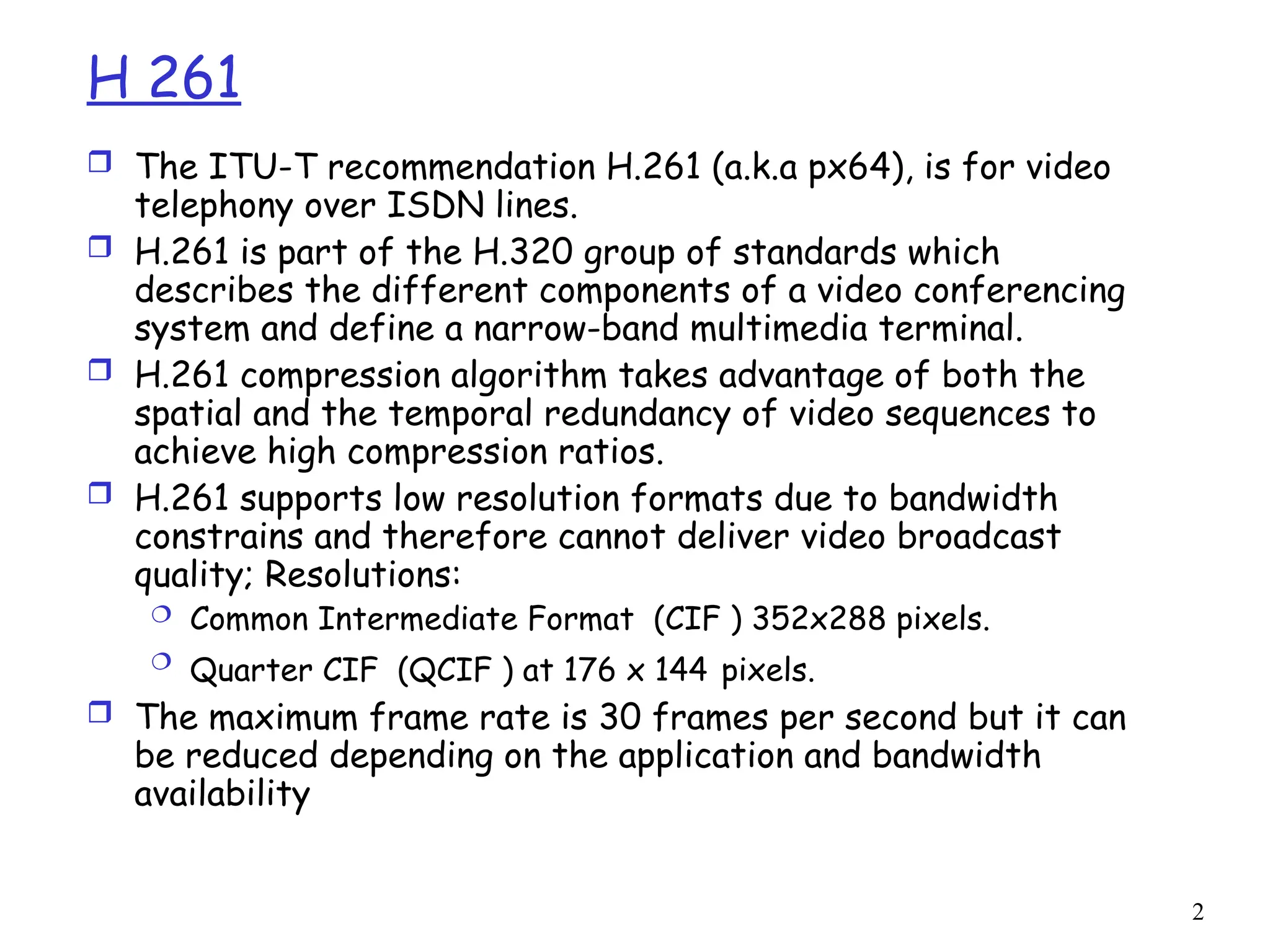 H.261 is a video coding standard for low-rate bit streams suitable for video telephony over ISDN, utilizing inter and intra-frame coding with resolutions like QCIF and CIF. It exploits spatial and temporal redundancies to achieve compression, but results in lower video quality compared to broadcast standards. The document also discusses motion vector coding, rate control mechanisms, H.261 bitstream format, and introduces H.263 as an improved low bit-rate standard.