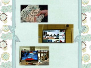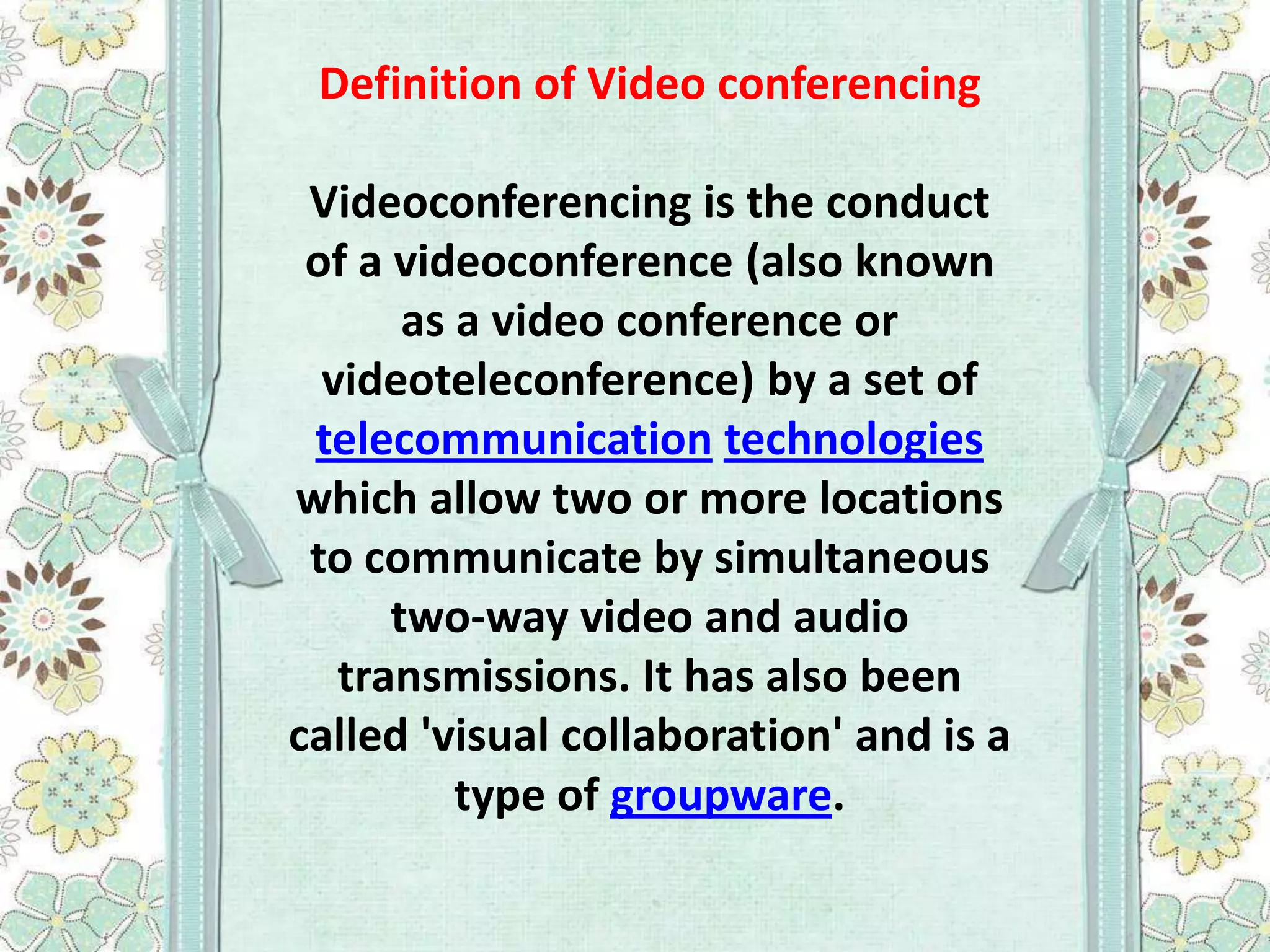 Video conferencing allows for real-time two-way video and audio communication between two or more locations. It can be used to deliver distance education by enabling interaction between teachers and remote students. Some benefits are reducing travel costs, increasing class sizes, and providing access to experts anywhere. However, video conferencing also faces limitations such as high setup costs, technical issues, and lack of in-person interaction. It works best when teachers and students initially meet in person before using the technology. Universities like the University of Alaska use video conferencing to connect classrooms, conduct interviews, and collaborate across institutions.
