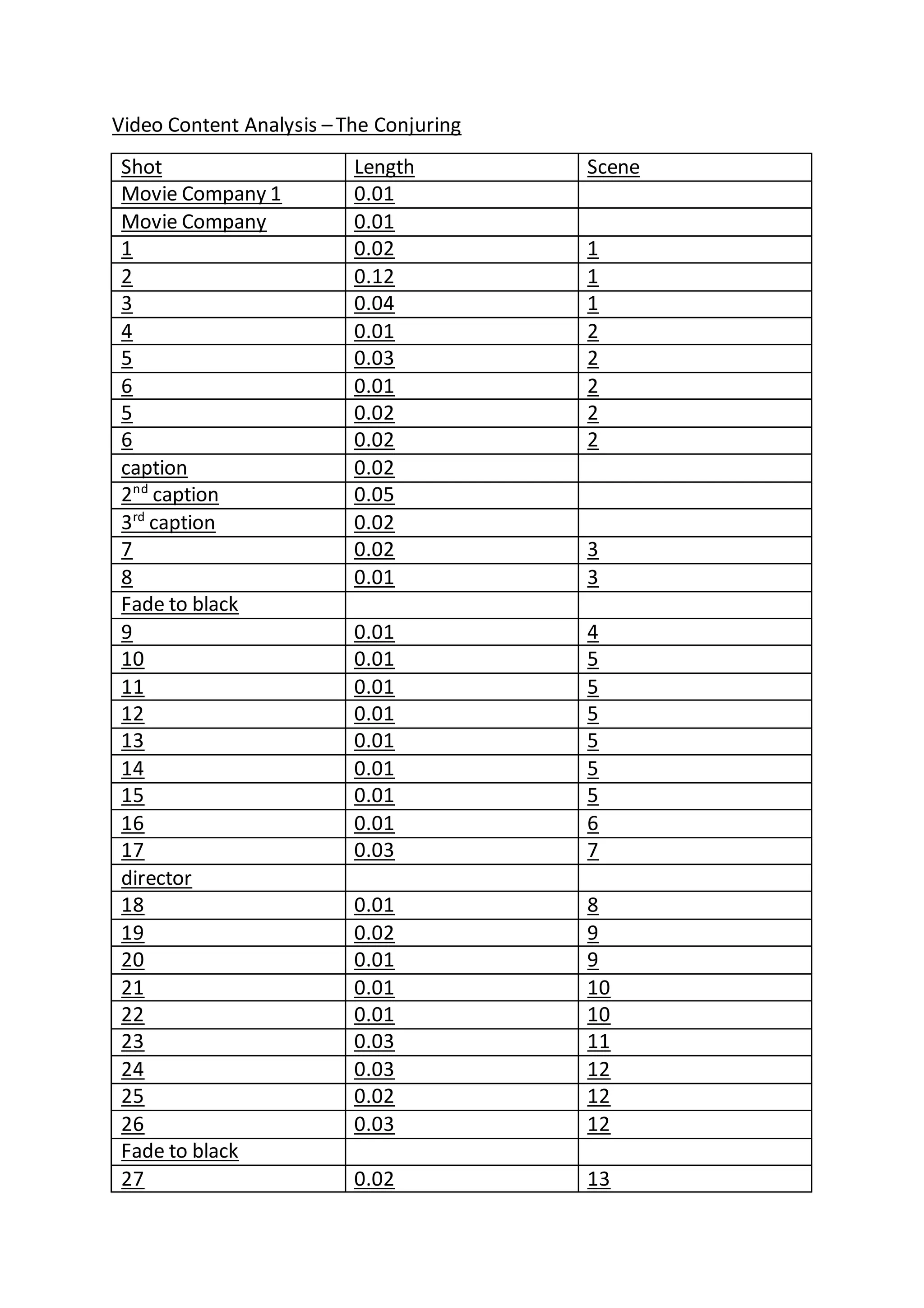 This document contains a list of 66 shots from the movie "The Conjuring" with the length of each shot and the scene it belongs to. The shots range in length from 0.01 to 0.12 minutes. There are 28 different scenes represented in the list. Captions and fades to black are also included throughout.