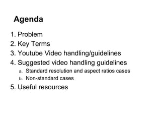 2. It discusses standardizing on 16:9 aspect ratio and resolutions like 720p and 480p. Non-standard videos should be encoded to fit these without pillarboxing/letterboxing.