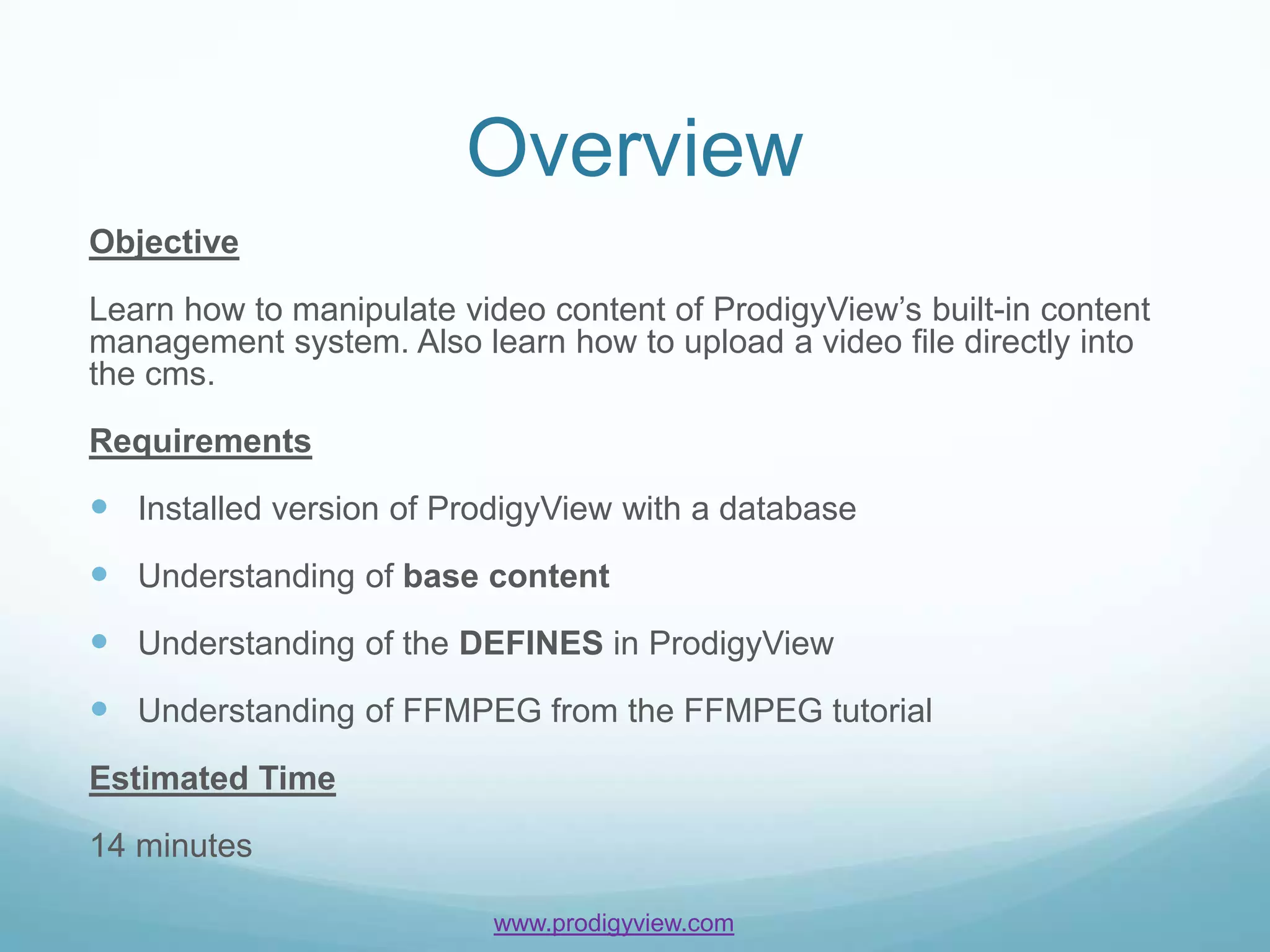The document provides an overview of how to manage video content using ProdigyView's content management system, including uploading and converting video files. It outlines the requirements, methods for creating, updating, and deleting video content, and offers examples of usage as well as API references. Users can create video content by passing arguments into specific methods and search or retrieve information based on content IDs.