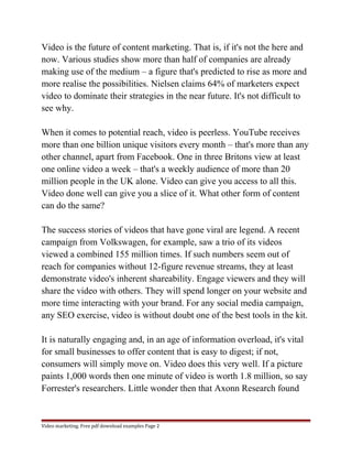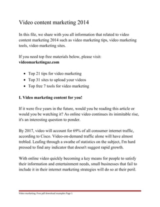This document provides information about video content marketing in 2014 including tips, tools, and sites for video marketing. It discusses how online video is growing rapidly and will account for 69% of internet traffic by 2017. It emphasizes that video marketing is important for businesses to engage customers and drive traffic. Specifically, it notes that video can increase time spent on a website, social sharing of content, and create a more positive brand perception. The document then provides several tips for effective video marketing such as using logos and URLs, creating compelling titles and content, and distributing videos beyond just YouTube.