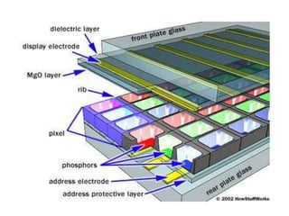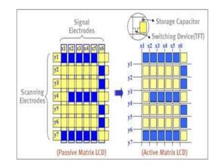 Liquid crystal displays (LCDs) are the most common display technology. They work by manipulating the orientation of liquid crystals, which allows light to pass through polarized lenses. LCDs have faster response times than older cathode ray tube (CRT) displays. Other display technologies discussed include organic light emitting diodes (OLEDs), digital light processing (DLP), and plasma display panels (PDPs). Emerging technologies like field emission displays (FEDs) aim to improve on LCD and CRT by allowing electron emission without high temperatures.
