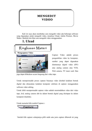 Modul ini membahas cara mengedit video menggunakan beberapa perangkat lunak seperti Ulead, Adobe Premier, dan Movie Maker. Dijelaskan tahapan-tahapan dasar mengedit video mulai dari pengambilan video, pemotongan video, penambahan efek, hingga ekspor hasil akhir.