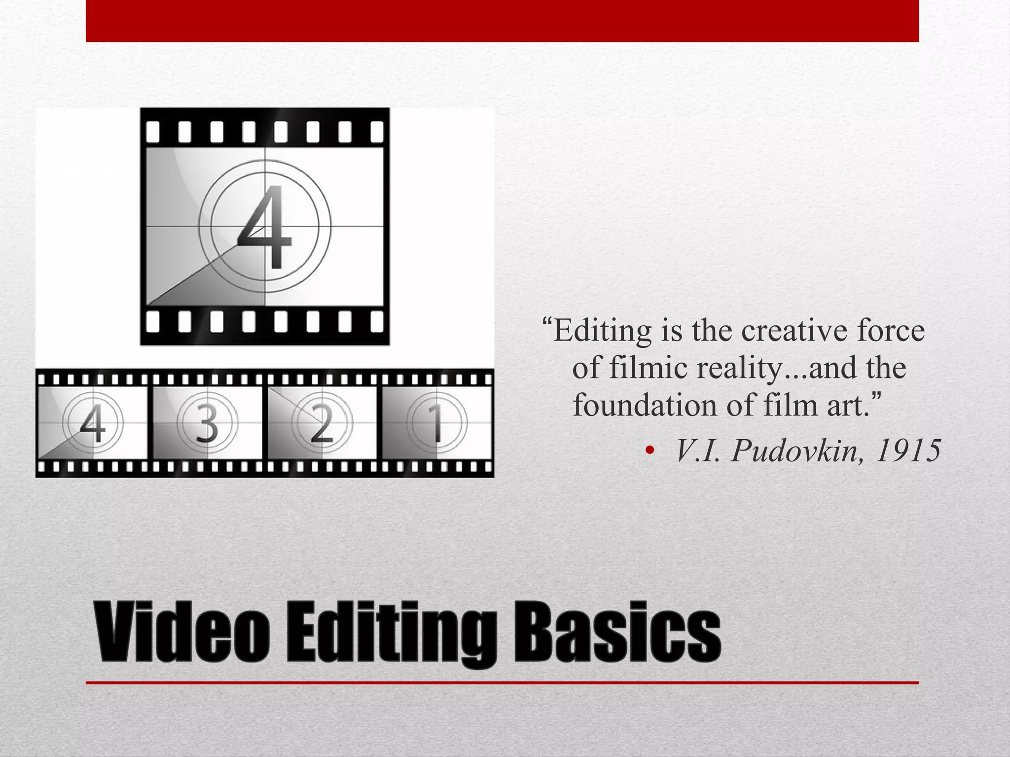 The document discusses various video editing techniques such as continuity editing, parallel cutting, and thematic editing. Continuity editing involves arranging shots in a logical sequence to suggest progression of events or cause and effect. Parallel cutting cuts between different storylines happening simultaneously to vary pace and heighten interest. Thematic editing rapidly cuts between shots based on a central theme rather than a logical narrative. Proper use of techniques like insert shots, cutaways, and exploring motivation can enhance storytelling and believability.
